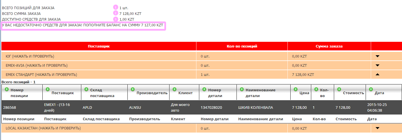 Проверьте состав заказа на предмет ошибок и верного количества заказываемых запчастей. (1) Всего позиций запчастей в заказе (в одной позиции может быть несколько запчастей одно типа - 4 свечи, 2 амортизатора и т.д.) (2) Общая сумма заказа (3) Доступные средства для заказа ВНИМАНИЕ!!! В случае если сумма доступных средств для заказа (3) будет меньше суммы заказа (2) - кнопка ПОДТВЕРДИТЬ ЗАКАЗ не появится и вместо нее будет наптись о необходимости пополнения баланса на необходимую сумму